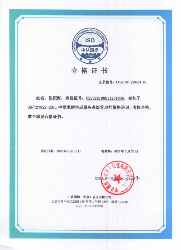 授予張積海售后服務(wù)高級(jí)管理師資格