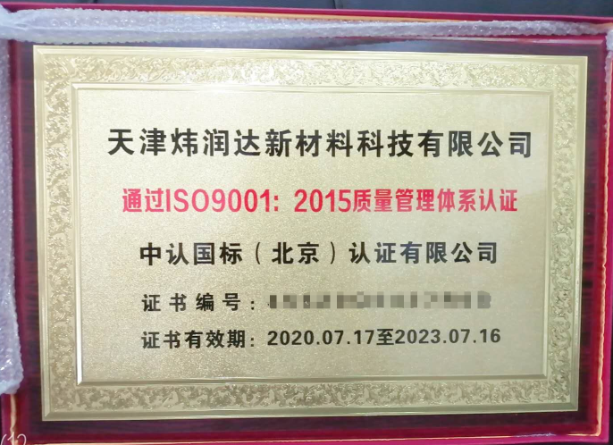天津煒潤(rùn)達(dá)新材料科技有限公司與2020年7月17日獲得我機(jī)構(gòu)質(zhì)量管理體系證書,除紙質(zhì)版證書外,額外訂做了銅牌證書